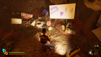 左側に見える顔の描かれたホワイトボードの前の破壊されたパソコンのモニターの上にドカーンスティックが突き刺さっています。
